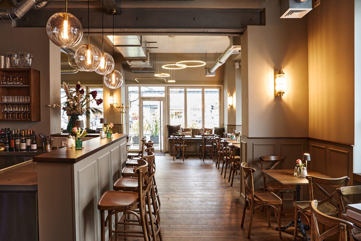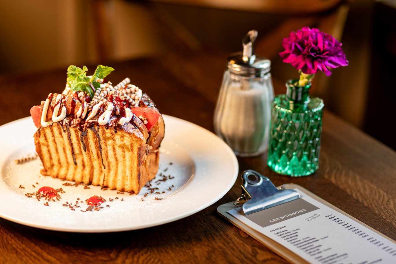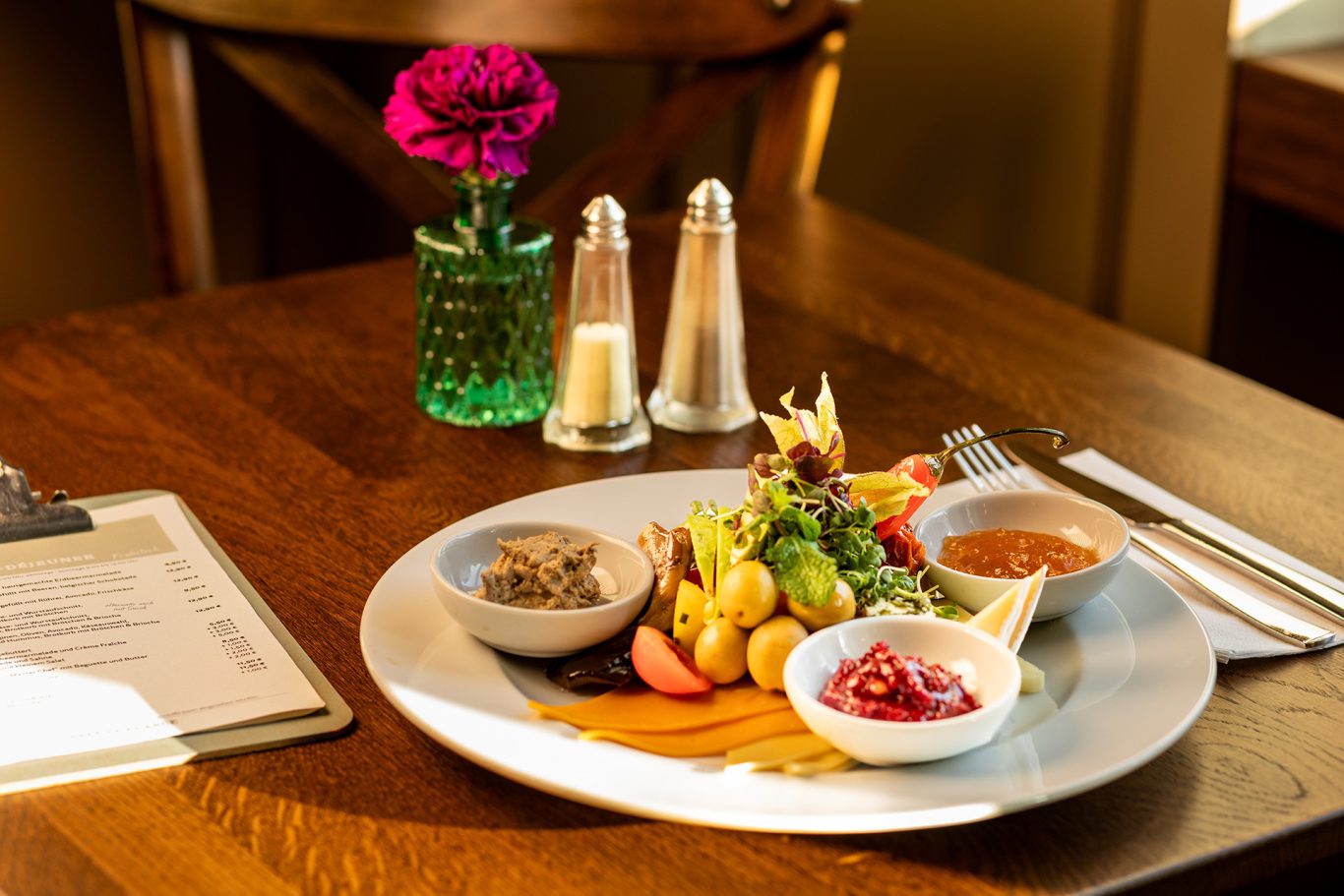 Große Frühstückskarte, moderne Bistroküche mit wechselndem Mittagstisch & täglicher Kuchenauswahl.